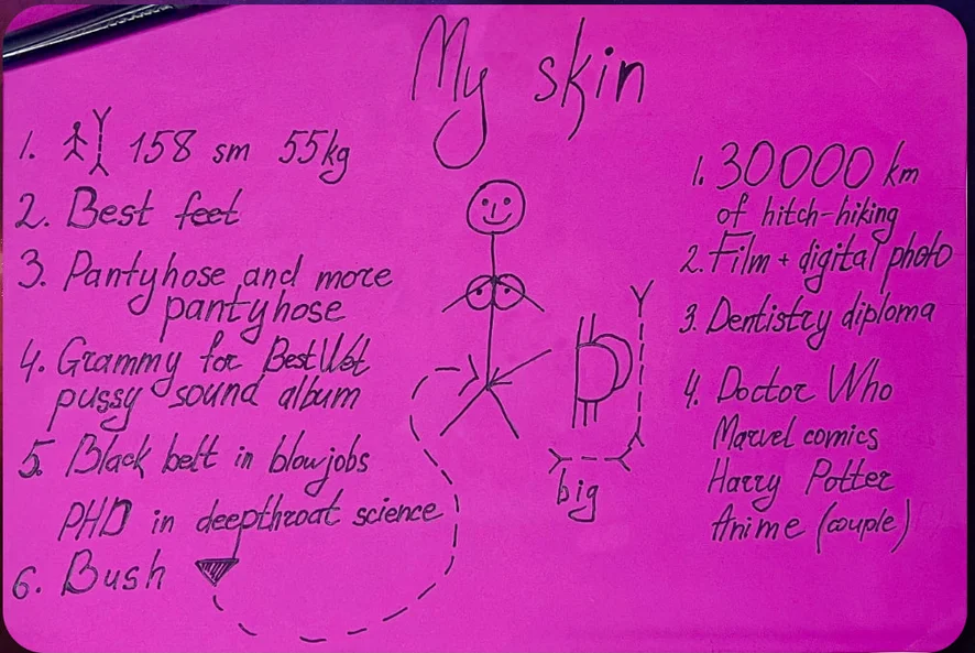 Đồ chơi núm vú, Cao gót, Nylon, Thổi kèn, Ở trần, Take off pantyhose, Fingering through pantyhose, Nylon footjob, nude seamless pantyhose, Bú tràn họng, Móc cua, Quan hệ tay ba, Ngồi lên mặt, Xóc bằng chân, Mê bàn chân, Fuck through nylons w dildo, Creamy fuck w dildo, Kiểu Cưỡi Ngựa, Củ dildo hay Máy rung, Hướng dẫn Tự sướng, Cực khoái